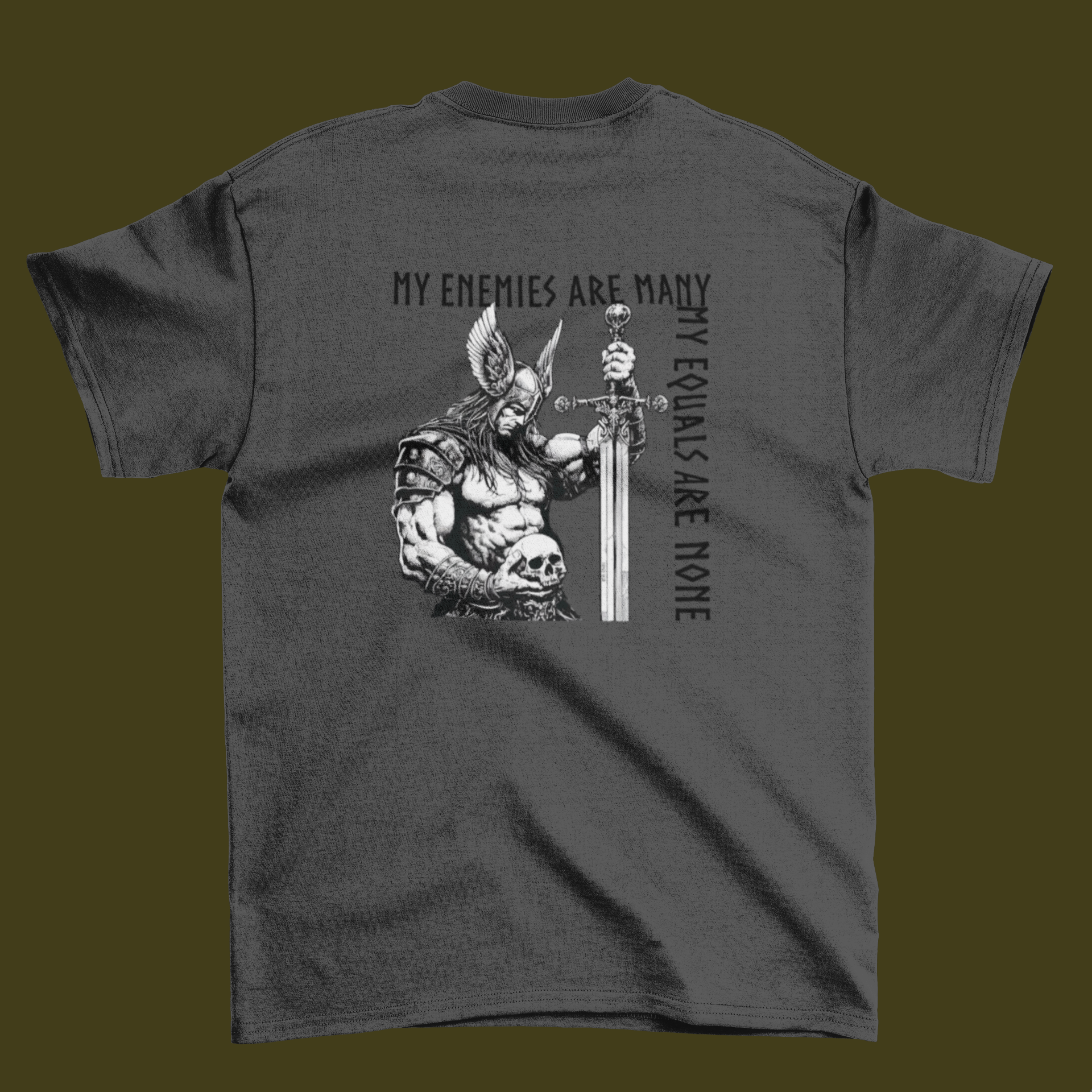 Unleash your inner warrior with this bold graphic tee featuring a striking, highly detailed custom illustration. "My enemies are many, my equals are none" is showcased on the back of the shirt, symbolizing strength, resilience and victory over every battle. Rendered in dramatic black-and-white contrast, the artwork stands out against the fabric, giving the shirt an elite, rugged and artistic edge.
